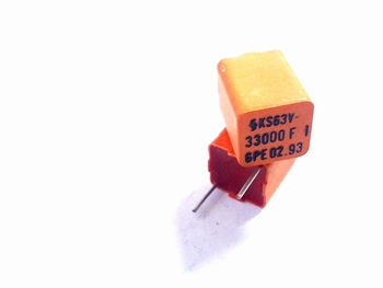 Styroflex / polypropyleen capacitor 33nF 63V radial RM 10mm. Measurements 10mm x 10mm x 12mm